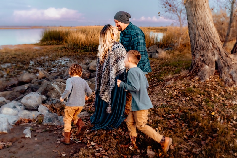 Family Photographer, a mom and dad walk outside as their young boys run beside them