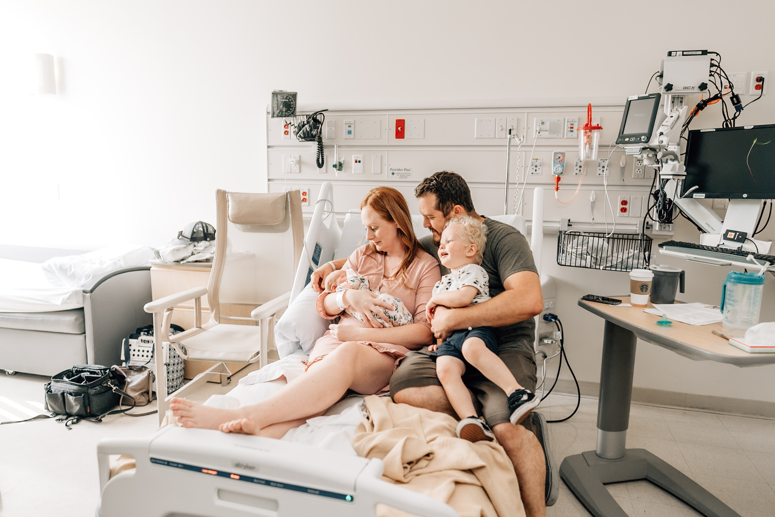 mother with her son welcoming a new baby into the world in a hospital setting
