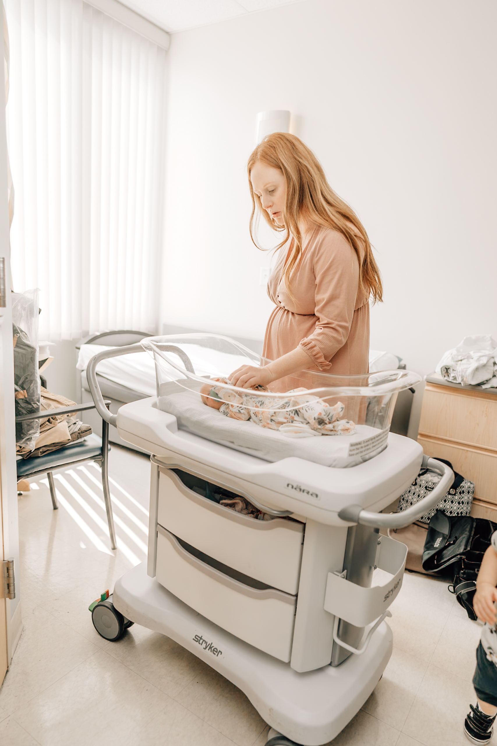 mother with her son welcoming a new baby into the world in a hospital setting